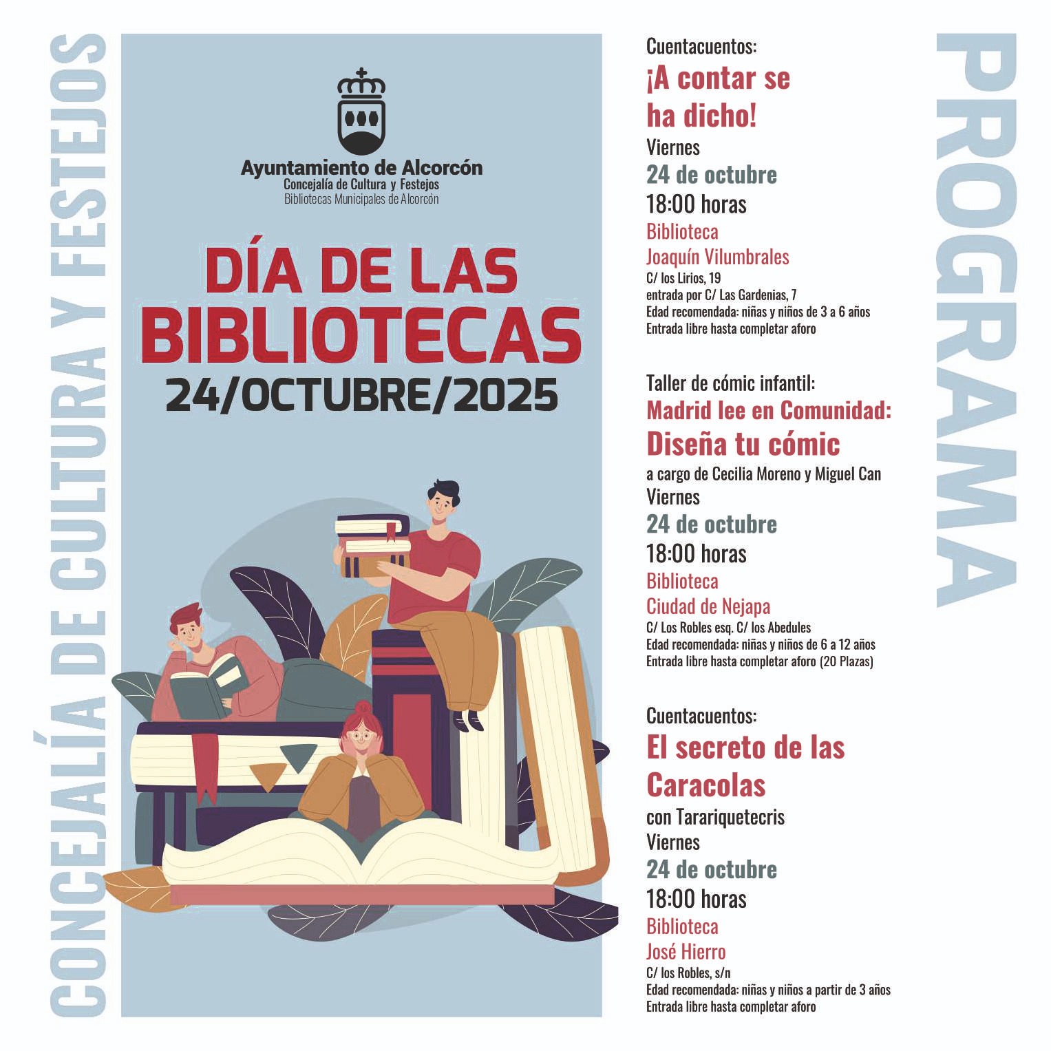 El próximo viernes 24 de octubre, se celebra el Día de las Bibliotecas y a través de una completa programación que incluye cuentacuentos y talleres creativos, las bibliotecas municipales de Alcorcón se convertirán este viernes en puntos de reunión para disfrutar, aprender y compartir en torno a los libros y la imaginación.