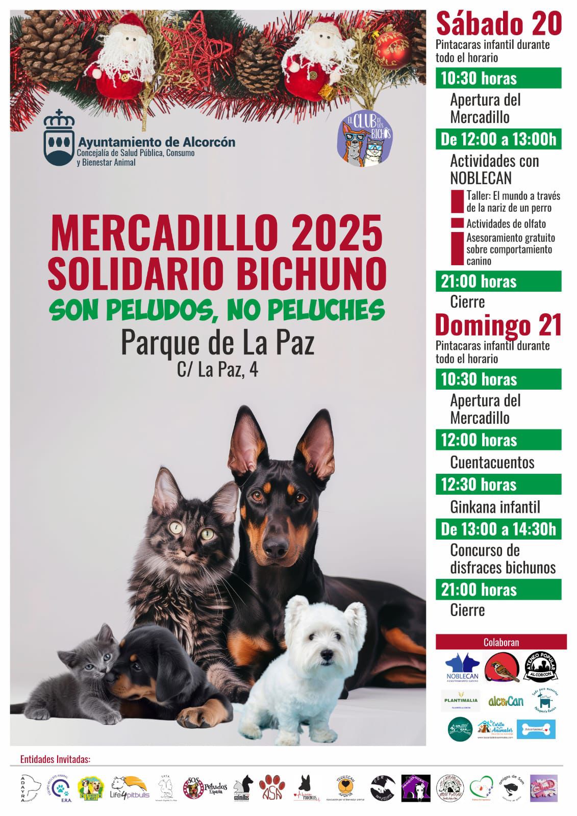 El Ayuntamiento de Alcorcón, a través de la Concejalía de Salud Pública, Consumo y Bienestar Animal, impulsa una nueva edición del Mercadillo Solidario Bichuno, bajo el lema ‘Son peludos, no peluches’. El objetivo es visibilizar la labor de las protectoras, fomentar la adopción responsable y sensibilizar a la ciudadanía sobre el bienestar animal, especialmente en fechas navideñas.