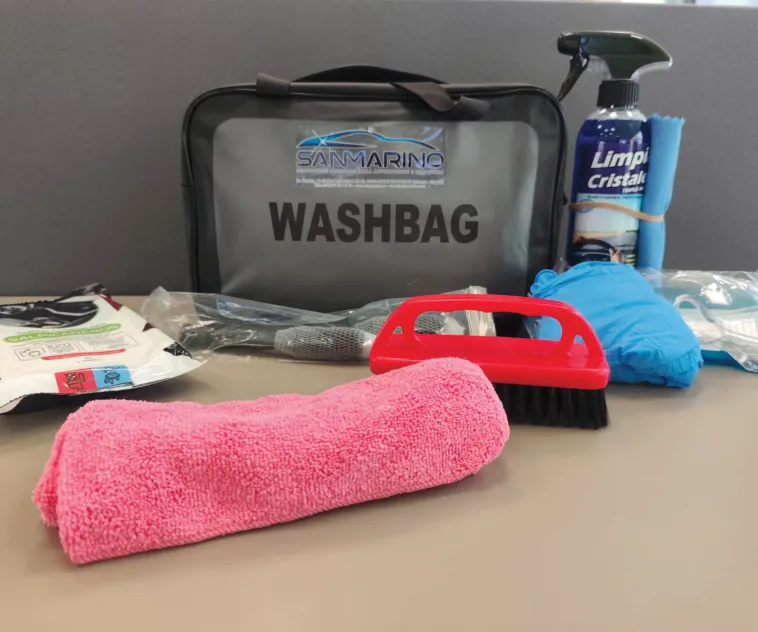 Cada kit está compuesto por una selección de artículos de limpieza: un limpiador universal para tapicerías, cristales y salpicaderos; una bolsa de toallitas húmedas especiales para salpicaderos; una bayeta de microfibra para limpieza general; una bayeta limpiacristales; un cepillo de cerdas suaves; dos brochas para superficies de difícil acceso; guantes de nitrilo y gafas de protección ocular.
