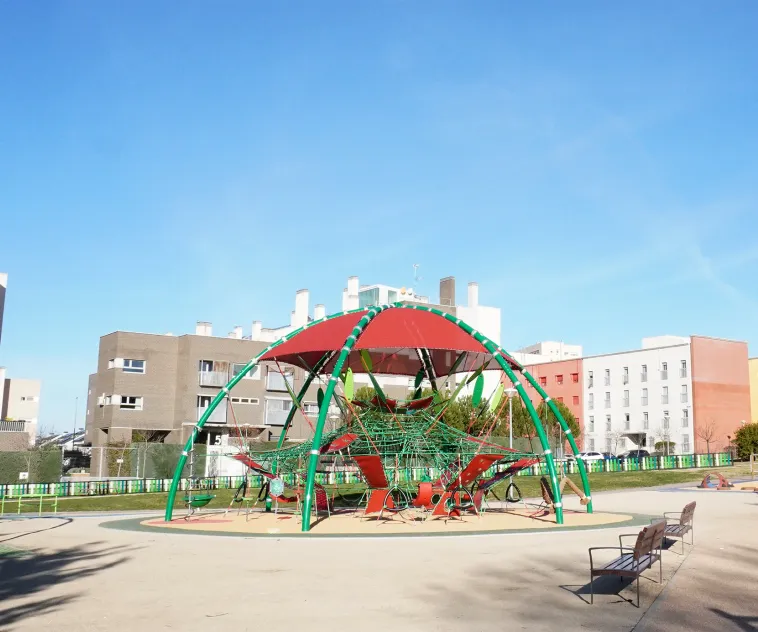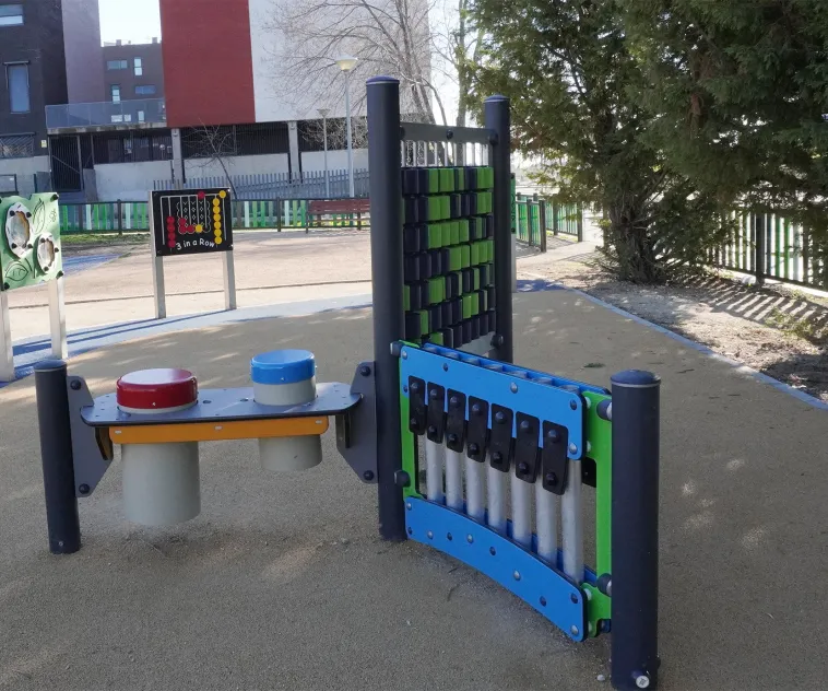 Este nuevo parque infantil inclusivo cuenta con diversos elementos como un columpio colectivo con capacidad para hasta 8 usuarios; dos camas elásticas, una de ellas con base cuadrada accesible para sillas de ruedas; un juego de muelle de integración con cuenco superior profundo que permite que el niño esté seguro en su interior; un tobogán y una cuerda de trepa de ladera.
