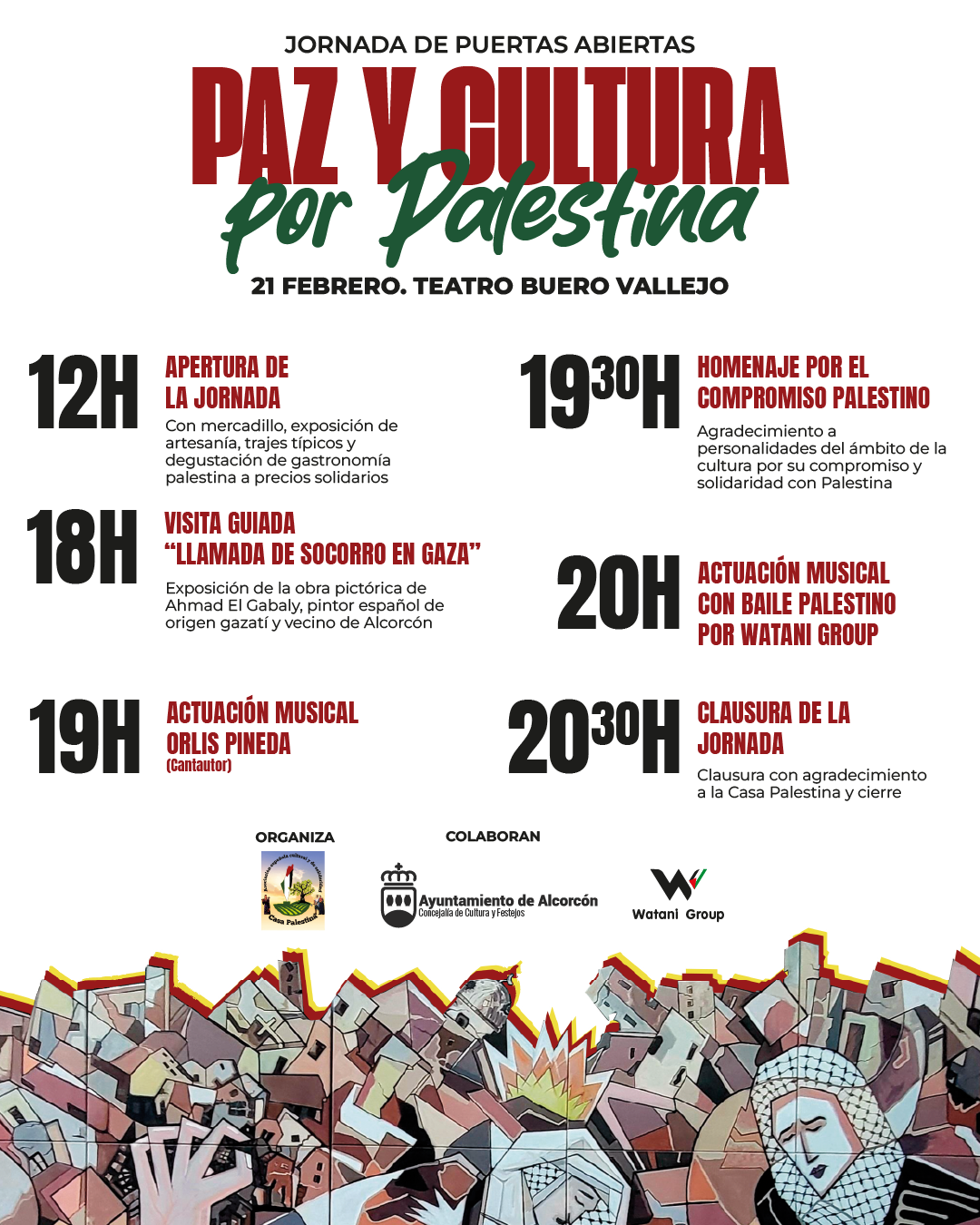 Compartir en:- El próximo 21 de febrero, a partir de las 12 horas, el Teatro Buero Vallejo de Alcorcón acogerá la Jornada de Puertas Abiertas ‘Paz y Cultura por Palestina’, un encuentro cultural y solidario que busca seguir visibilizando la violencia contra el pueblo palestino, especialmente en Gaza, y reforzar los lazos de solidaridad entre culturas y pueblos.