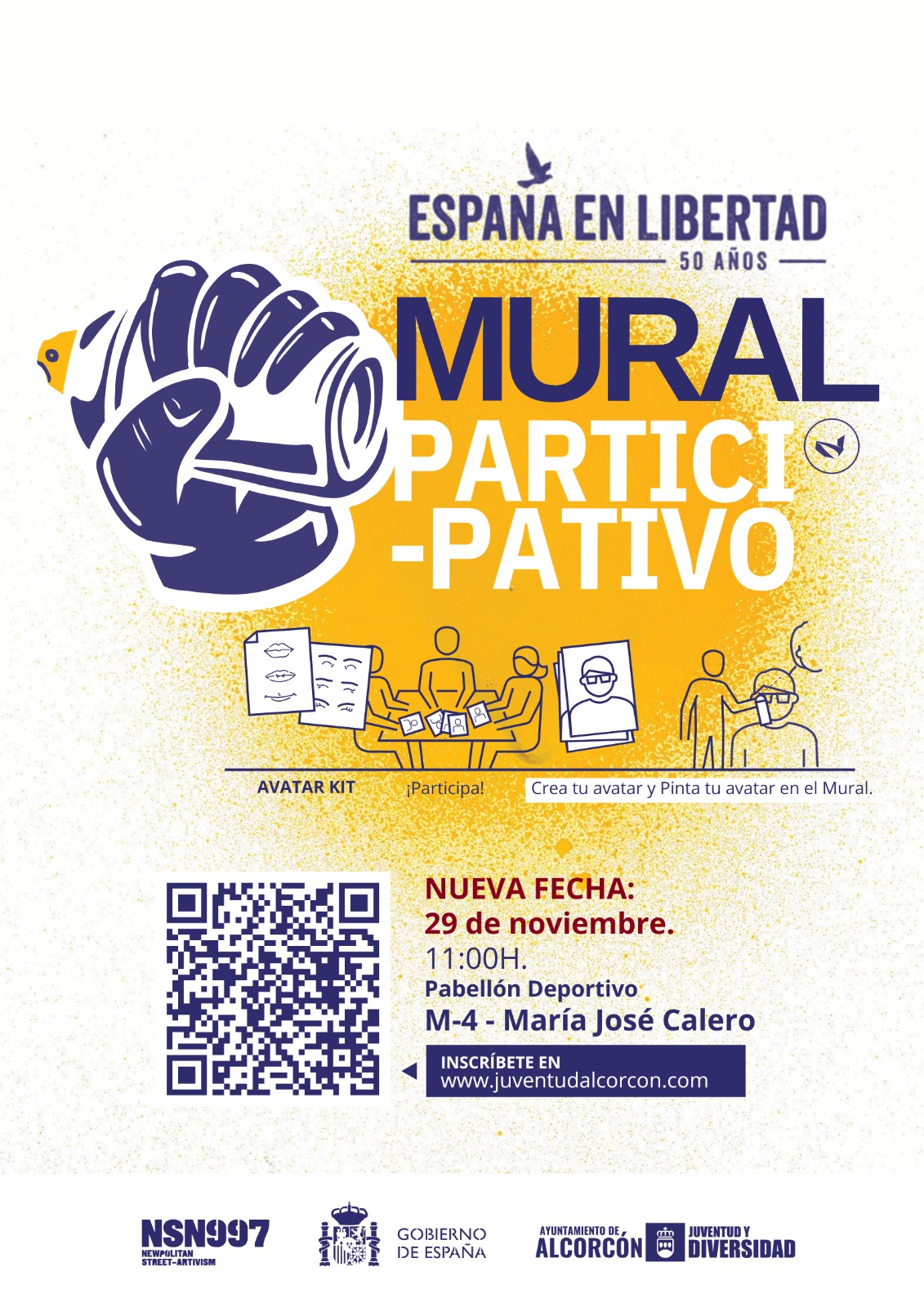 • Esta propuesta consiste en la creación de un mural de forma simultánea en varios municipios de la región como compromiso con los valores democráticos de nuestra sociedad durante las últimas cinco décadas. Este mural, que se creará el próximo 29 de noviembre en el polideportivo M4, se desarrollará a través de un Taller de Street Art que comenzará a las 11 horas. Los y las participantes (a partir de 12 años) deberán diseñar su propio avatar que se plasmará en un mural mediante la técnica del stencil y spray con la ayuda y acompañamiento de un artista urbano durante el proceso.