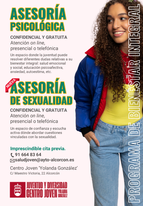 Por otro lado, la Asesoría de Sexualidad ofrece orientación en un espacio no clínico ni médico, desde un enfoque educativo, preventivo y de promoción de la salud sexual y afectiva para brindar información rigurosa, acompañamiento empático y herramientas prácticas. Todo ello, con el fin de  que puedan tomar decisiones informadas y responsables, promoviendo una sexualidad saludable, libre y respetuosa. Su horario es de mañana los lunes, de 12 a 14.30 horas; y de tarde los viernes, de 17.30 a 20 horas.