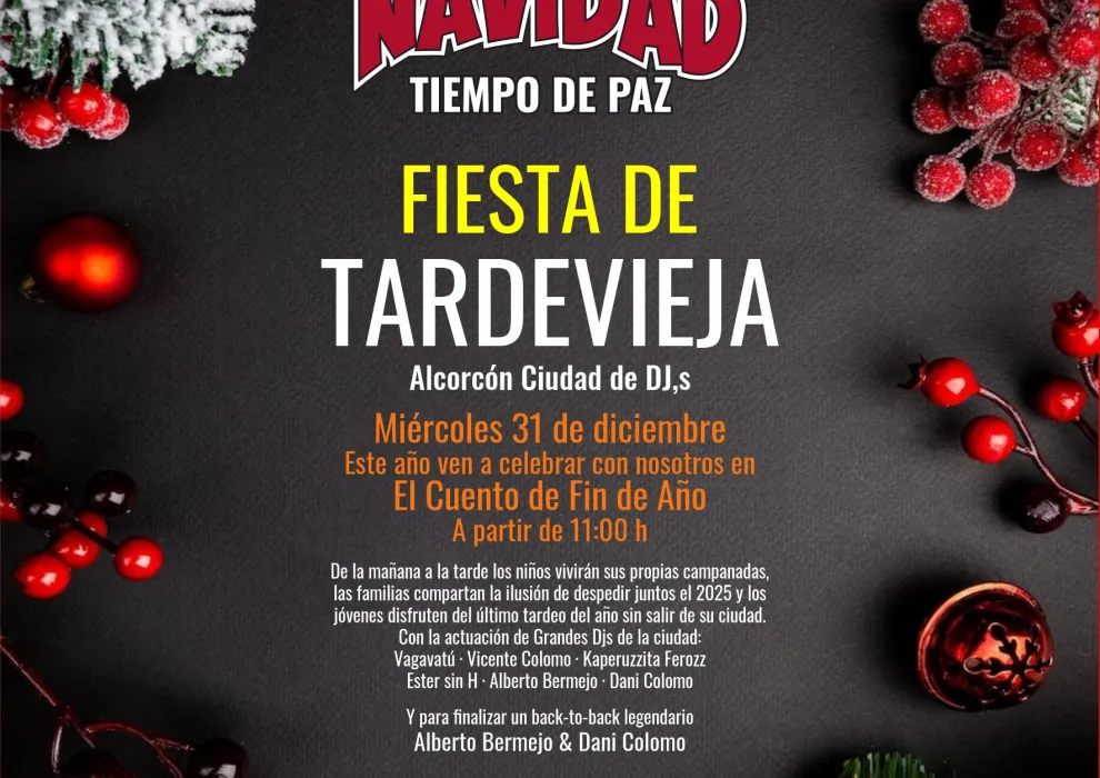 Y para despedir el año, los niños y niñas de Alcorcón podrán vivir sus propias campanadas para disfrutar en familia el miércoles 31 de diciembre a partir de las 11 horas. Los y las más jóvenes disfrutarán del último ‘tardeo’ del año en el Auditorio Paco de Lucía del Recinto Ferial con la jornada previa a la noche de fin de año amenizada por DJs de la ciudad como Vagavatú, Vicente Colomo, Kaperuzzita Ferozz, Ester sin H, Alberto Bermejo y Dani Colomo. Un gran ambiente, que finalizará con un back-to-back legendario con Alberto Bermejo & Dani Colomo.