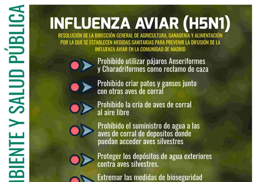 La Comunidad de Madrid ha activado medidas sanitarias de prevención frente a la influenza aviar (H5N1) con el objetivo de proteger la salud animal y evitar la propagación del virus.