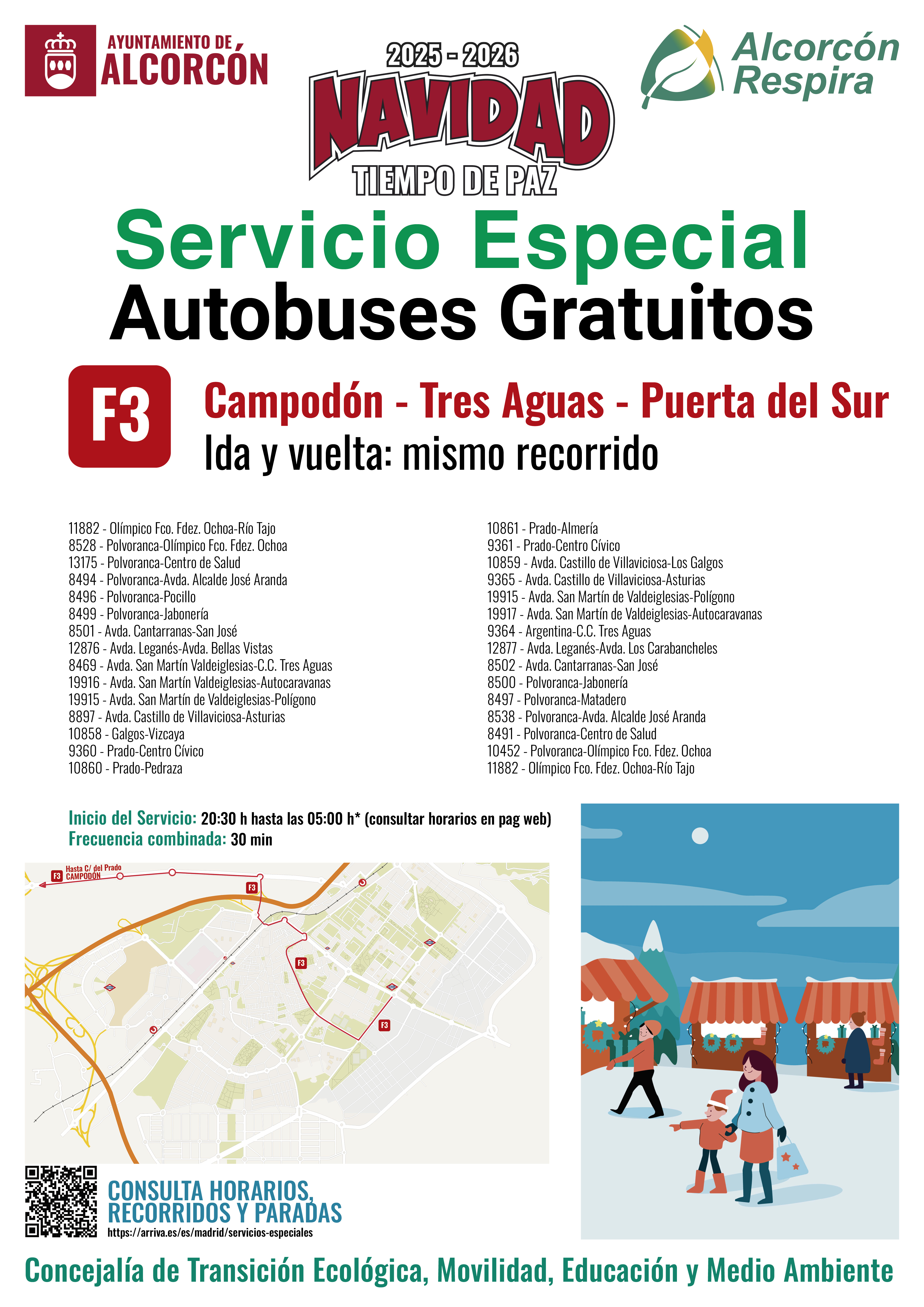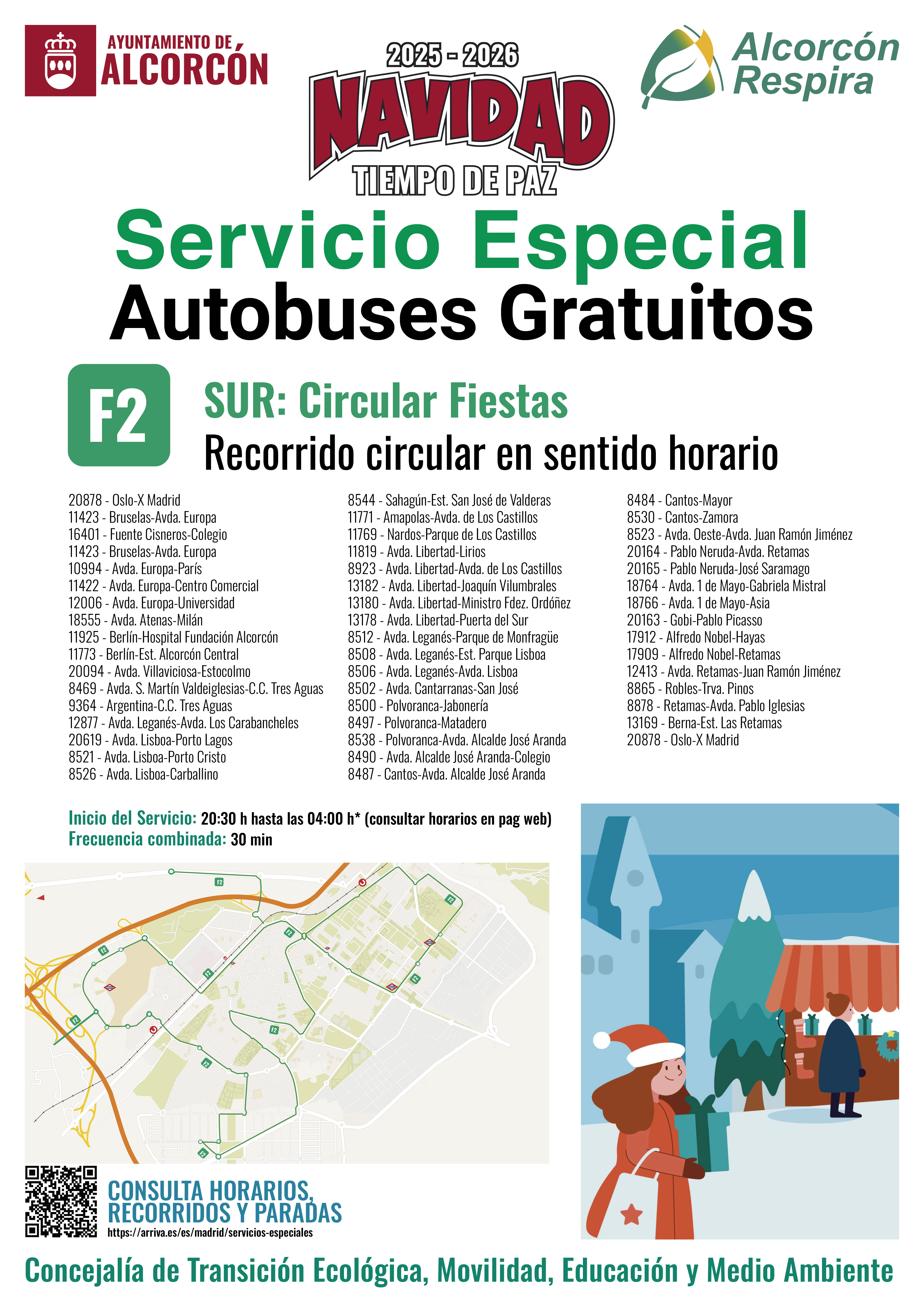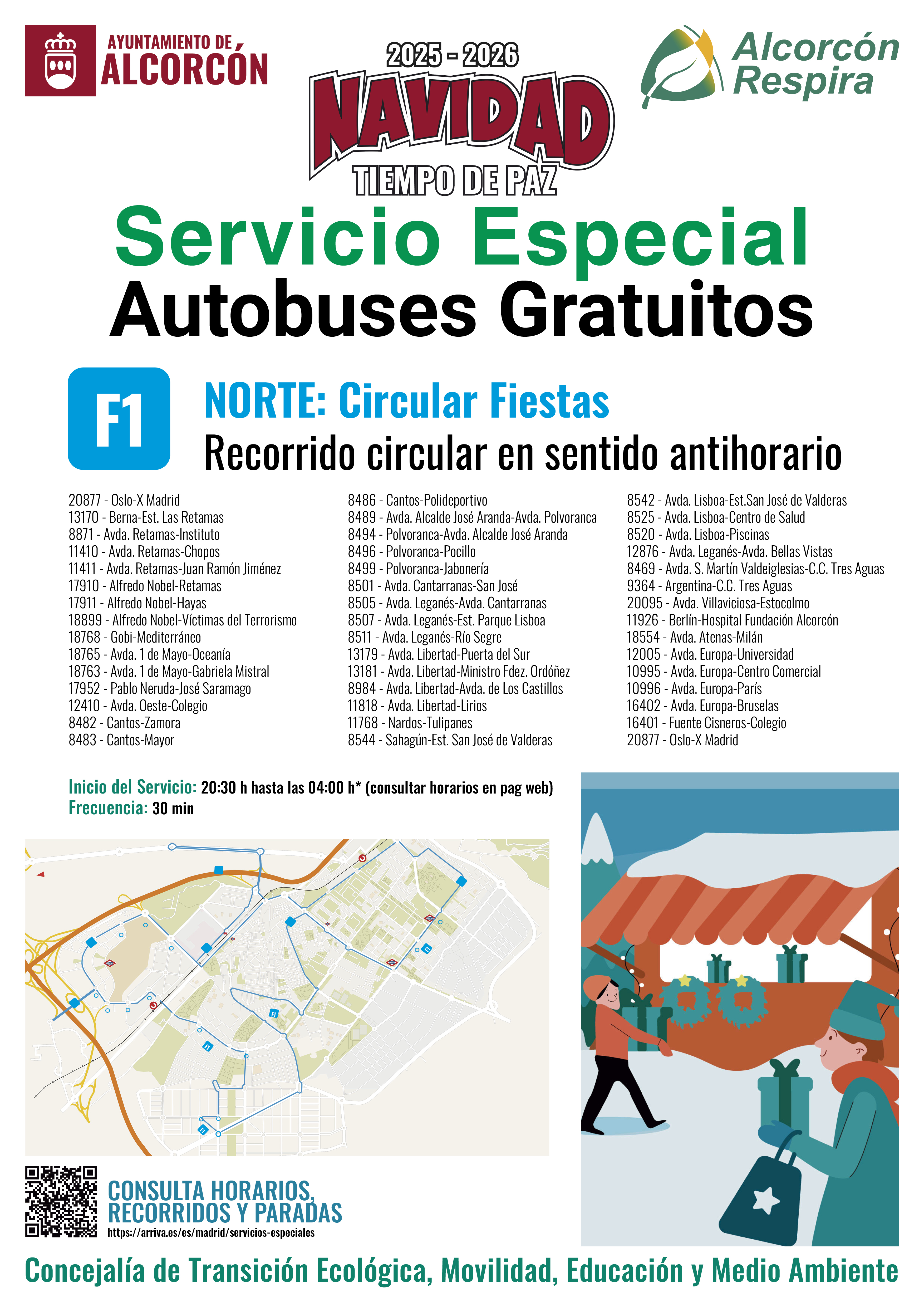 La Concejalía de Movilidad del Ayuntamiento de Alcorcón pone en marcha un servicio especial de autobuses eléctricos y gratuitos con motivo de las fiestas navideñas, con el objetivo de facilitar los desplazamientos, fomentar el uso del transporte público y reducir la dependencia del vehículo privado durante uno de los periodos de mayor actividad social, cultural y comercial del año.