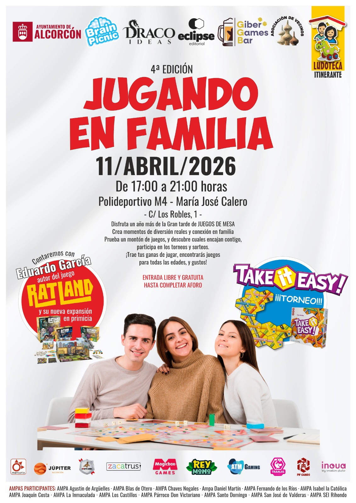 Sábado, 11 de abril | De 17:00 a 21:00 | AMPA Agustín de Argüelles AMPA Blas de Otero AMPA Chaves Nogales AMPA Daniel Martín AMPA Fernando de los Ríos AMPA Isabel la Católica AMPA Joaquin Costa AMPA La Inmaculada AMPA Los Castillos AMPA Párroco Don Victoriano AMPA Santo Domingo AMPA San José de Valderas AMPA SEI Rihondo | JUGANDO en familiaACTIVIDAD FAMILIAR GRATUITA PARA TODAS LAS EDADES.Lugar de Realización: Polideportivo M4 -"Maria josé Calero" C/ Los Robles, 1 - 28922 - Alcorcón